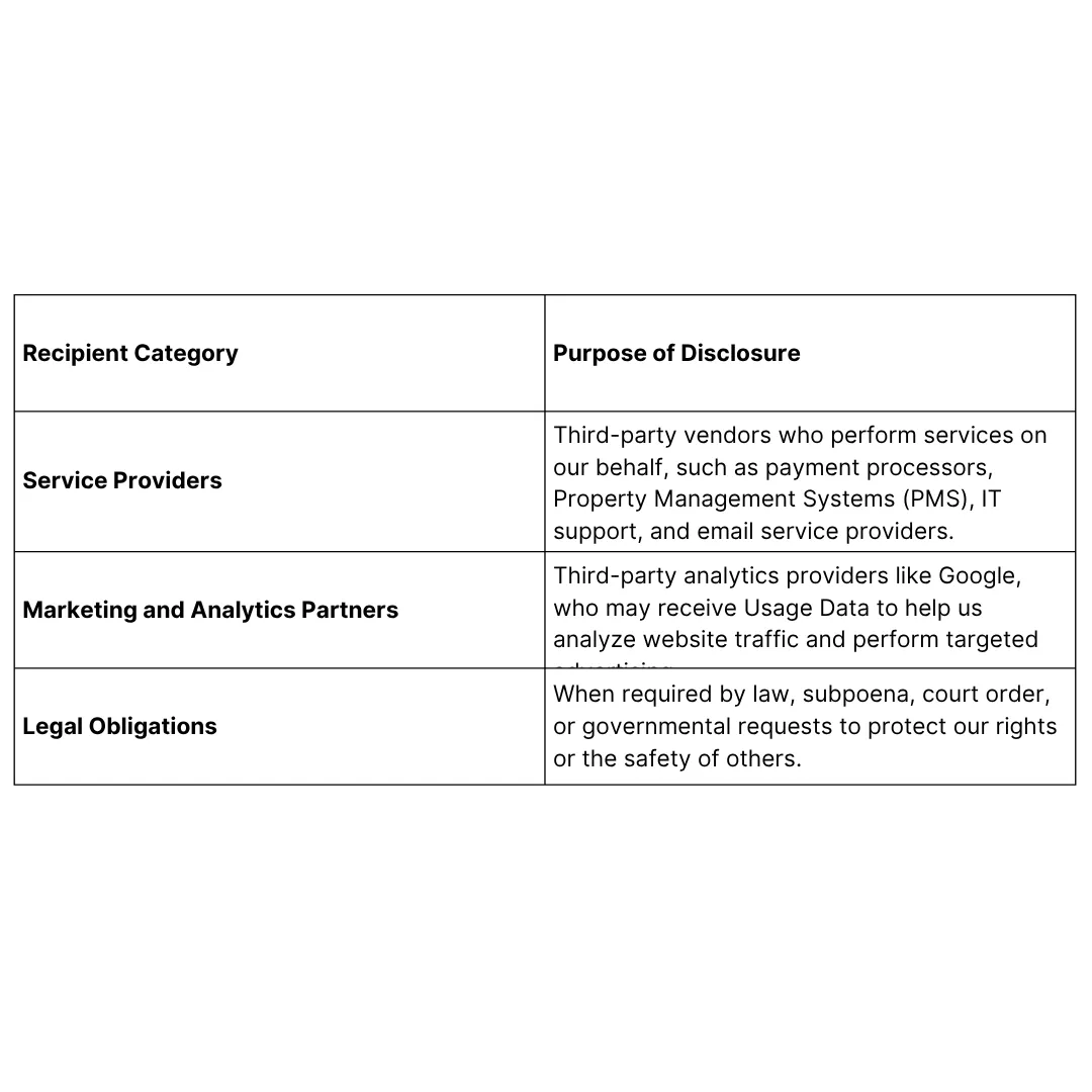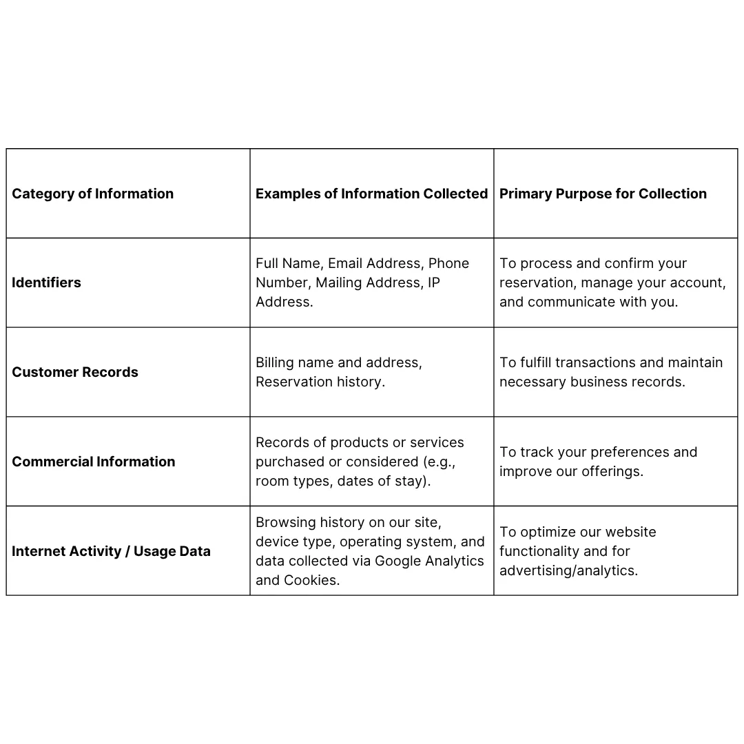 - Operational Management: To support and improve hotel operations and Services, personalize and enhance user experience, and conduct analytics using tools like Google Analytics.